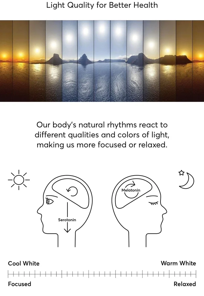 Light has a massive impact on human wellbeing and our ability to focus or relax. This is a result of the particular qualities of natural light that change throughout the day. The body is naturally responsive to cool-toned light and releases hormones that signal the brain to wake up and be alert. Alternatively, warm-toned light puts the brain at ease, making it easier to relax and fall asleep.