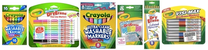 The Color works with the entire Crayola line of dry-erase and washable products. Many other brands work, too… Crayola is our favorite and has a huge product line accessible online and in stores.